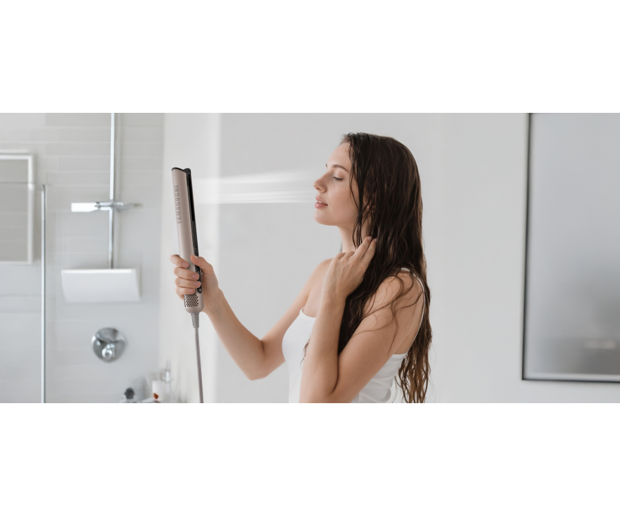 Фен-выпрямитель сочетает в себе передовые технологии укладки и бережного выпрямления волос. Мощный направленный поток создает зону низкого давления, мягко «затягивая» пряди в воздушную прослойку между пластинами. Волосы свободно парят в потоке нагретого воздуха, который ускоряет испарение влаги и одновременно разглаживает кутикулу за счет оптимального натяжения прядей. В отличие от обычных выпрямителей, фен бережно ухаживает за волосами, от корней до кончиков делая их гладкими и послушными, как после салонного ламинирования.